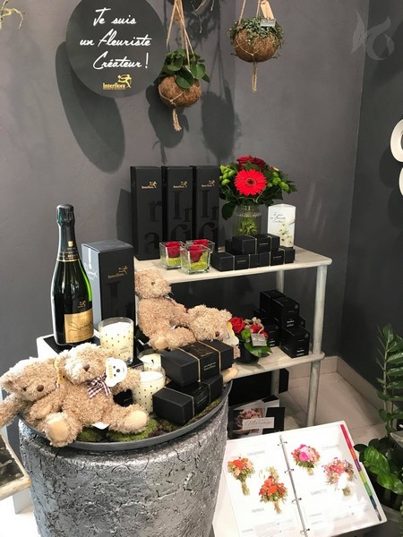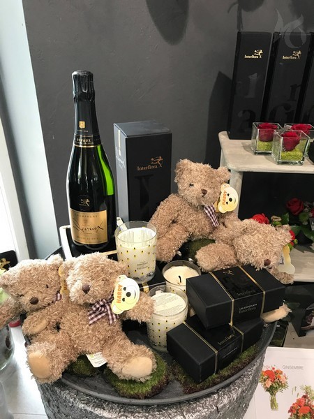 Une multitude d’idées cadeaux, un petit plaisir de plus aux fleurs : amandines, bougies, bulle d’eau, vases cylindres, nounours, Champagne.